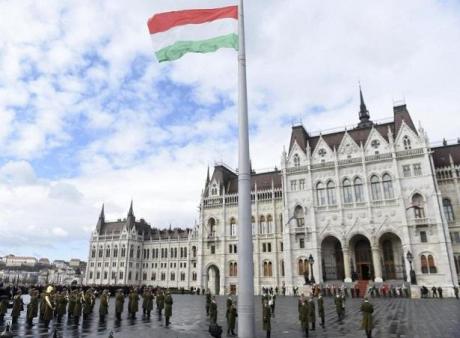 Katonai tiszteletadás mellett, Áder János köztársasági elnök és Kövér László, az Országgyűlés elnöke jelenlétében vonták fel a nemzeti lobogót az Országház előtt a március 15-i nemzeti ünnep alkalmából pénteken.