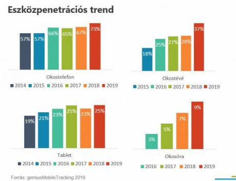 A 15 éves vagy idősebb hazai internetezőknek már közel háromnegyede rendelkezik okostelefonnal. Idén az okostelefonosok bázisa picit nagyobb arányban nőtt, mint a korábbi években. 95%-uk szokott csatlakozni az internetre – ők heti átlag 13 órát és 30 percet töltenek mobilon való internetezéssel.