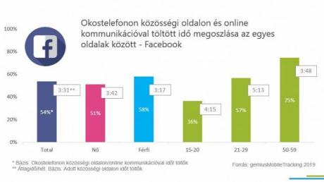 A férfiak idejükből az átlaghoz képest nagyobb hányadot szánnak a Facebookra (58%). A 15–20 évesek töltik itt arányaiban a legkevesebb időt, a közösségi oldalakon való kommunikációjuknak csak harmadát teszi ki. A 21–29 évesek körében még sokkal stabilabban tartja magát a Facebook (57%). Az 50–59 éves korosztály közösségi oldalon való tevékenykedésének pedig háromnegyed részét a Facebook böngészése és a Messengeren való beszélgetés alkotja. (Forrás: Origo)